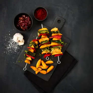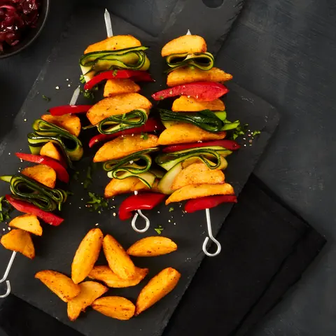 - Eingerollte Zucchinischeiben, Wedges und Paprikastücke abwechselnd auf die Spieße stecken.
