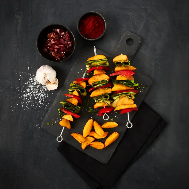 Vegane Kräuter Wedges-Gemüse Spieße mit Rauchpaprika-Zwiebel-Marmelade
